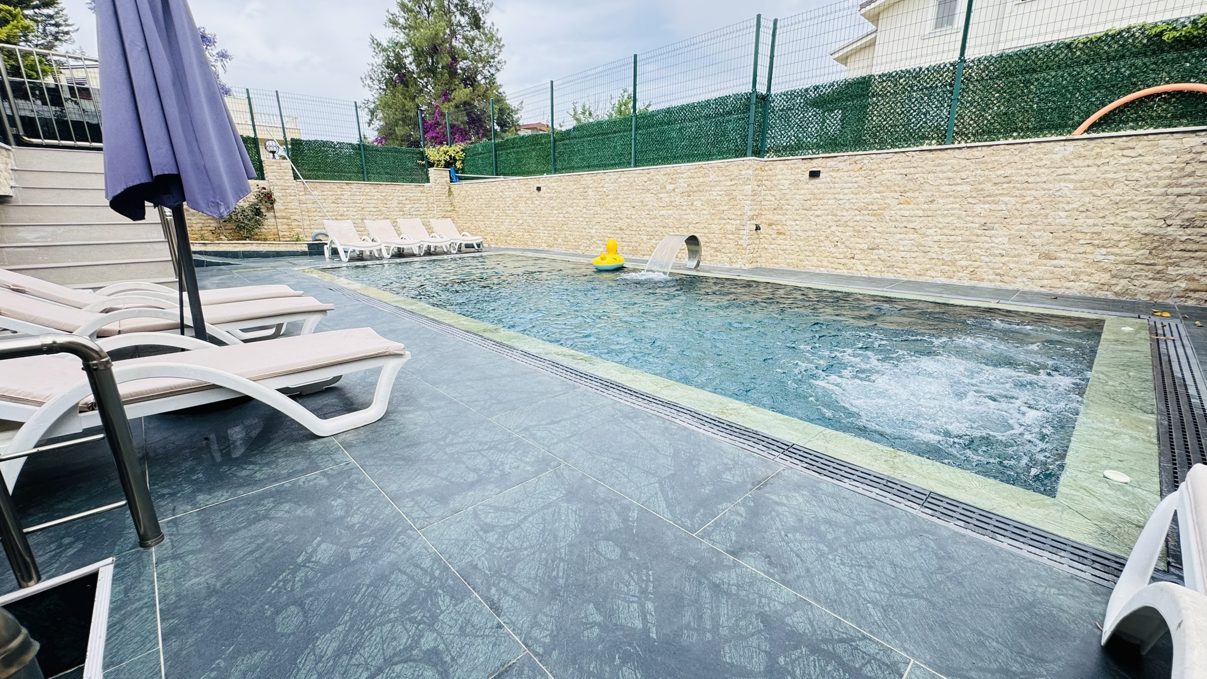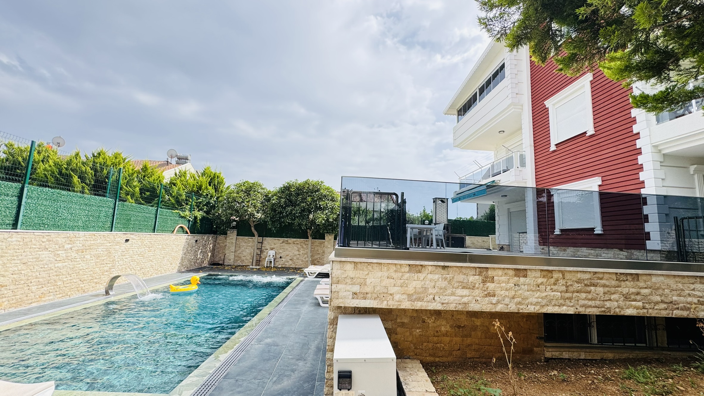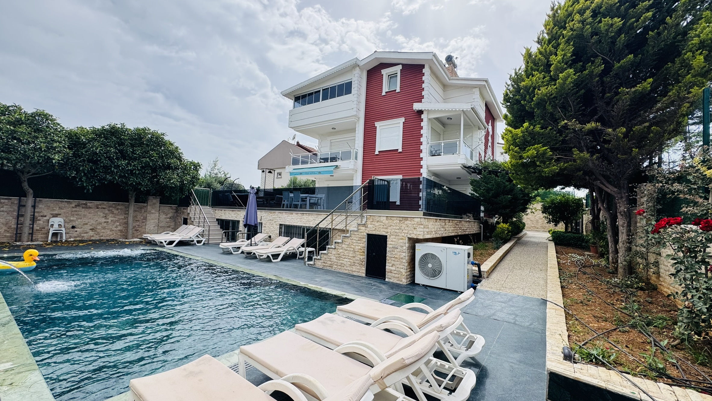 Villamızda sadece misafirlerimizin kullanımına özel olarak tasarlanmış ısıtmalı kış havuzu ve soğutmalı yaz havuzu bulunmaktadır. Bu sayede dört mevsim boyunca tatilin keyfini çıkarabilir, hem yazın serinliğini hem de kışın sıcaklığını konforla yaşayabilirsiniz. Özellikle muhafazakâr aileler için tasarlanan özel havuz sistemi, dışarıdan görünmeyecek şekilde yapılandırılmıştır ve tam mahremiyet sağlar.